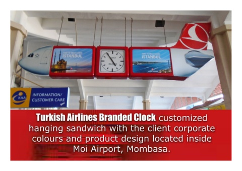 Turkish Airlines Branded Clock customized hanging sandwich with the client corporate colours and product design located inside Moi Airport, Mombasa.