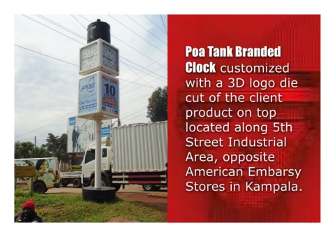 Poa Tank Branded Clock customized with a 3D logo die cut of the client product on top located along 5th Street Industrial Area, opposite American Embarsy Stores in Kampala.