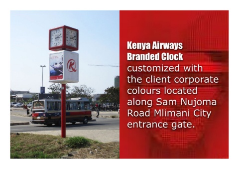 Kenya Airways Branded Clock customized with the client corporate colours located along Sam Nujoma Road Mlimani City entrance gate.