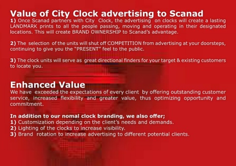 1) Once Scanad partners with City Clock, the advertising on clocks will create a lasting