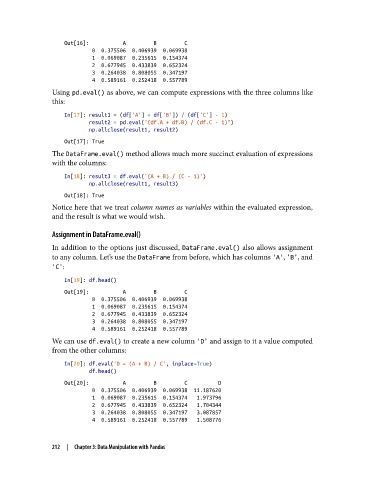 In[20]: df.eval('D = (A + B) / C', inplace=True)