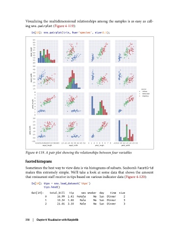 Sometimes the best way to view data is via histograms of subsets. Seaborn’s FacetGrid