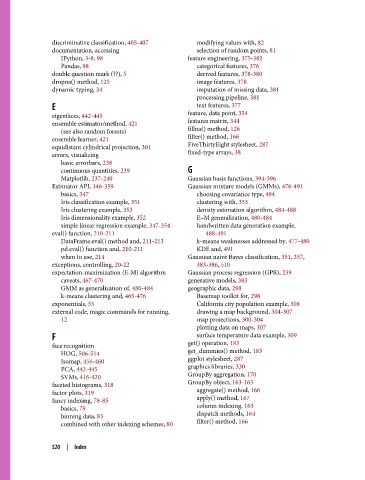 Estimator API, 346-359 Gaussian mixture models (GMMs), 476-491