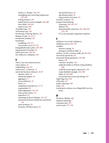 Python vs. Pandas, 188-192 specialized ufuncs, 56