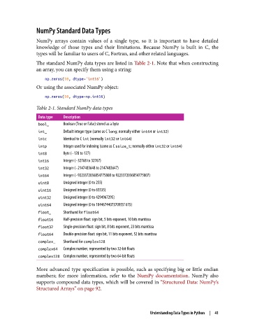 The standard NumPy data types are listed in Table 2-1. Note that when constructing