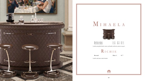 M IHAELA Back bar cabinet L 235 D 70 H 108 Front bar cabinet L 184 D 83 H 116 Leather and quilted leather, veneer, oval handles, with wine canteen on request R IC H IE Bar stool Diam 40 H 77 Leather and veneer, metal structure 165