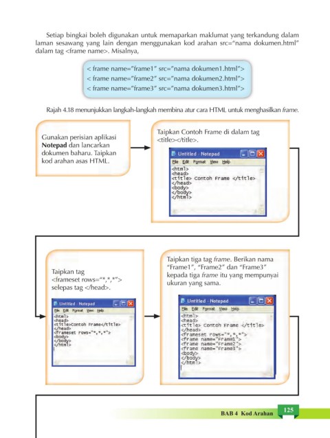 Rajah 4.18 menunjukkan langkah-langkah membina atur cara HTML untuk menghasilkan frame.