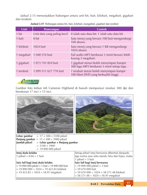 Jadual 2.15 menunjukkan hubungan antara unit bit, bait, kilobait, megabait, gigabait