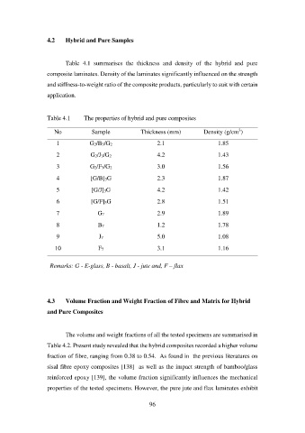 Table 4.1 summarises the thickness and density of the hybrid and pure