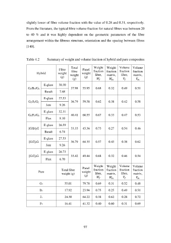 Table 4.2 Summary of weight and volume fraction of hybrid and pure composites