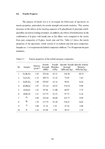 from pure composites of E-glass, basalt, jute and flax. Table 4.3 shows the tensile