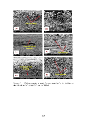 Figure 4.7 SEM micrographs of tensile fracture; (a) G2/B3/G2, (b) [G/B]3G, (c)