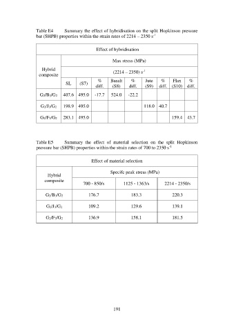 Table E4 Summary the effect of hybridisation on the split Hopkinson pressure
