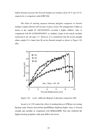 Figure 2.18 Load - deflection diagram of glass/jute composites [58]