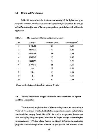 Table 4.1 summarises the thickness and density of the hybrid and pure