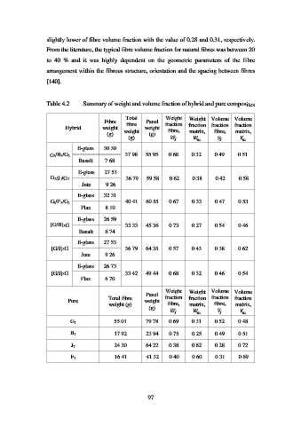 Table 4.2 Summary of weight and volume fraction of hybrid and pure composites