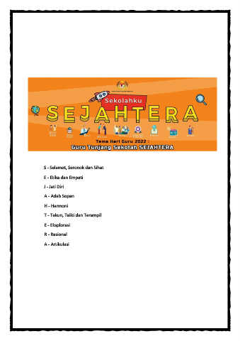 S - Selamat, Seronok dan Sihat E - Etika dan Empati J - Jati Diri A - Adab Sopan H - Harmoni T - Tekun, Teliti dan Terampil E - Eksplorasi R - Rasional A - Artikulasi