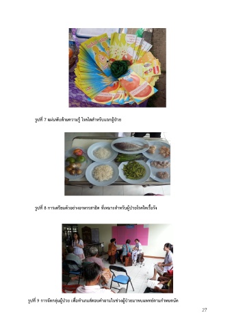 รูปที่ 7 แผ่นพับด้านความรู้ โรคไตสำหรับแจกผู้ป่วย รูปที่ 8 การเตรียมตัวอย่างอาหารสาธิต ที่เหมาะสำหรับผู้ป่วยโรคไตเรื้อรัง รูปที่ 9 การจัดกลุ่มผู้ป่วย เพื่อทำเกมส์ตอบคำถามในช่วงผู้ป่วยมาพบแพทย์ตามกำหนดนัด 27