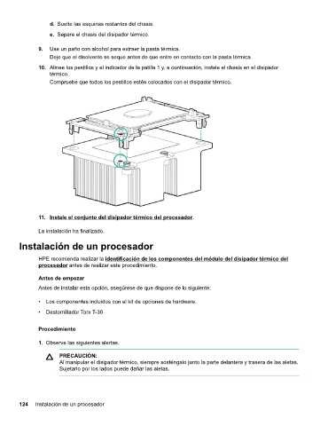 10. Alinee los pestillos y el indicador de la patilla 1 y, a continuación, instale el chasis en el disipador