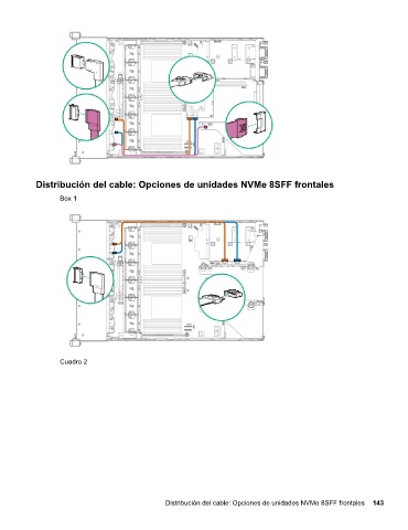 Distribución del cable: Opciones de unidades NVMe 8SFF frontales Box 1 Cuadro 2 Distribución del cable: Opciones de unidades NVMe 8SFF frontales 143