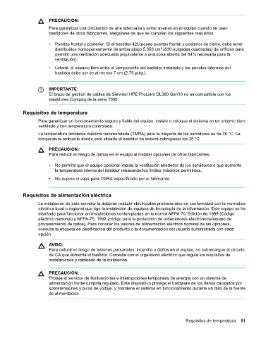 • No permita que el equipo opcional impida la ventilación alrededor de los servidores o que aumente