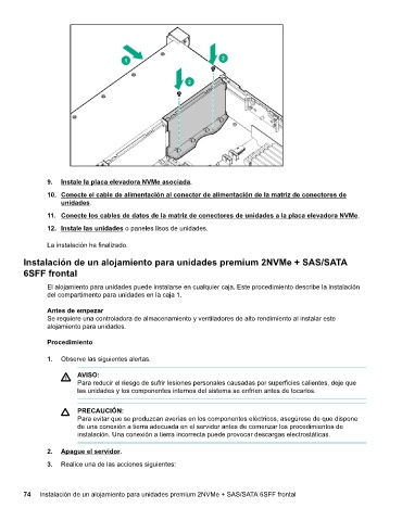 74 Instalación de un alojamiento para unidades premium 2NVMe + SAS/SATA 6SFF frontal