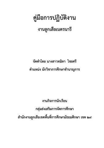คู่มือการปฏิบัติงาน งานลูกเสือเนตรนารี ิ จัดทำโดย นางสาวทมตา ไชยศรี ตำแหน่ง นักวิชาการศึกษาชำนาญการ งานกิจการนักเรียน กลุ่มส่งเสริมการจัดการศึกษา สำนักงานลูกเสือเขตพื้นที่การศึกษามัธยมศึกษา เขต ๒๙