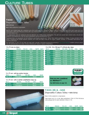 T400-3Y Polystyrene 5 Yellow 250 1000 T400-4A Polypropylene 13 x 100 7.2 Natural 1000