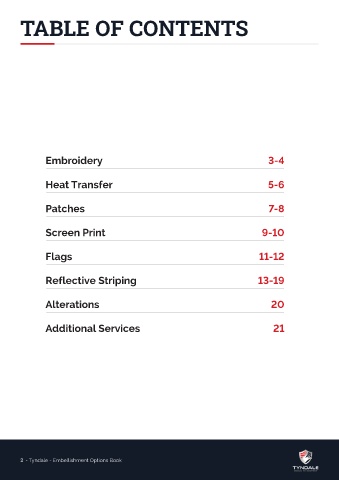 TABLE OF CONTENTS Embroidery 3-4 Heat Transfer 5-6 Patches 7-8 Screen Print 9-10 Flags 11-12 Reflective Striping 13-19 Alterations 2 0 Additional Services 21 2 - Tyndale - Embellishment Options Book