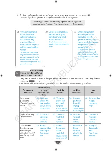 2. Berikan tiga kepentingan tentang fungsi sistem pengangkutan dalam organisma. TP2