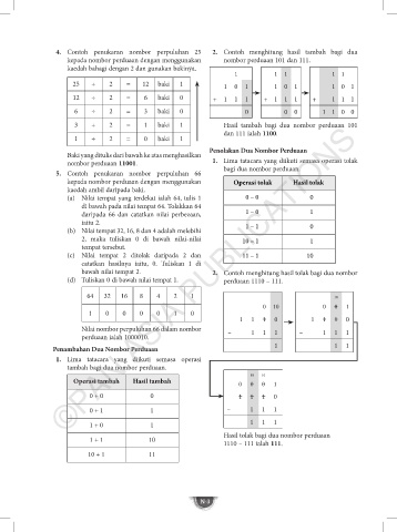 3 ÷ 2 = 1 baki 1 Hasil tambah bagi dua nombor perduaan 101