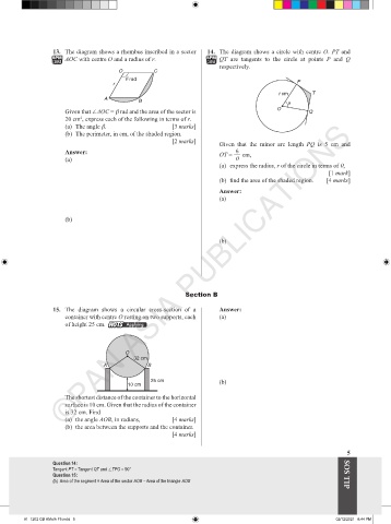 13. The diagram shows a rhombus inscribed in a sector 14. The diagram shows a circle with centre O. PT and