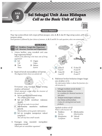 2. Rajah di bawah menunjukkan sel haiwan. B I dan III D II dan IV
