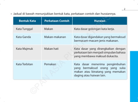 • Jadual di bawah menunjukkan bentuk kata, perkataan contoh dan huraiannya.