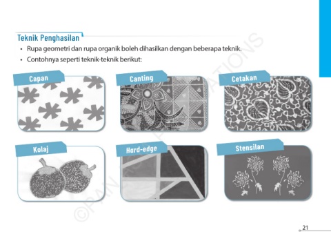 Teknik Penghasilan • Rupa geometri dan rupa organik boleh dihasilkan dengan beberapa teknik. • Contohnya seperti teknik-teknik berikut: Capan Canting Cetakan Stensilan Hard-edge Kolaj ©PAN ASIA PUBLICATIONS 21 21