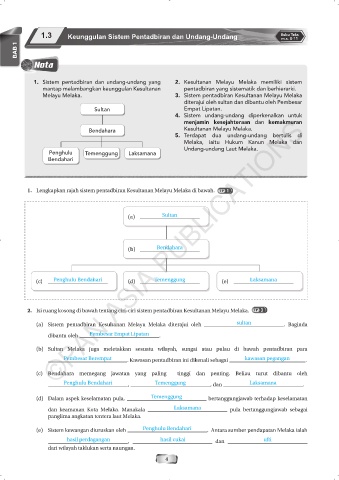 1. Lengkapkan rajah sistem pentadbiran Kesultanan Melayu Melaka di bawah. TP 1