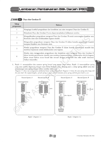 Diagram 1.1 shows two arrangements of identical elastic spring without load. Diagram 1.2 shows the same spring when hang with Lembaran PBD
