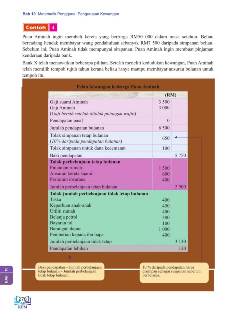 Bank X telah menawarkan beberapa pilihan. Setelah meneliti kedudukan kewangan, Puan Aminah