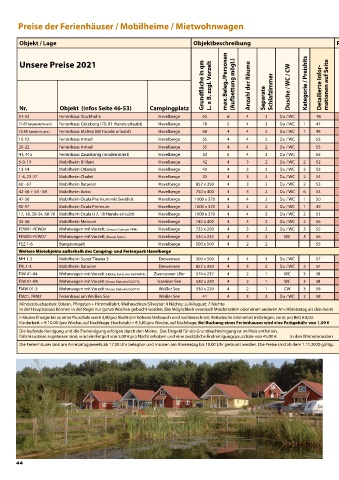 Preise der Ferienhäuser / Mobilheime / Mietwohnwagen Erläuterungen der Abkürzungen: Du/WC: mit Dusche/WC im Objekt;