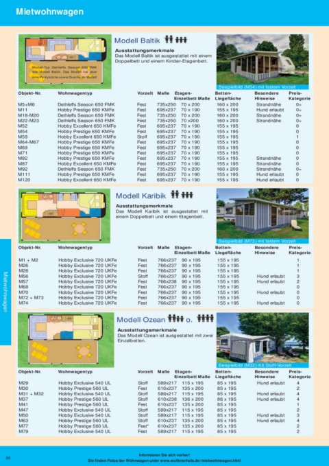 M26 Hobby Exclusive 720 UKFe Fest 766x237 90 x 195 155 x 195 1 Objekt-Nr. Wohnwagentyp Vorzelt Maße Etagen- Betten- Besondere Preis- Mietwohnwagen