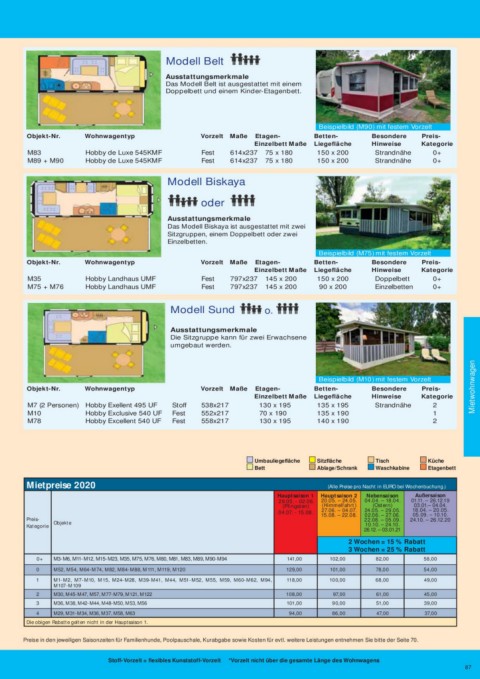 M26 Hobby Exclusive 720 UKFe Fest 766x237 90 x 195 155 x 195 1 Objekt-Nr. Wohnwagentyp Vorzelt Maße Etagen- Betten- Besondere Preis- Mietwohnwagen