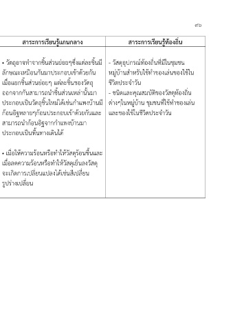 มาตรฐาน ว ๒.๑ เข้าใจสมบัติของ ๑. อธิบายว่าวัตถุประกอบขึ้นจากชิ้น • วัตถุอาจทำจากชิ้นส่วนย่อยๆซึ่งแต่ละชิ้นมี - วัสดุอุปกรณ์ท้องถิ่นที่มีในชุมชน