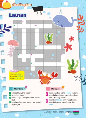 agar-agar. buas. Menegak 1 landak laut 2 karang 3 paus 4 jerung Melintang 1 udang kara 2 gurita 3 rumpai 4 ubur-ubur Jawapan: