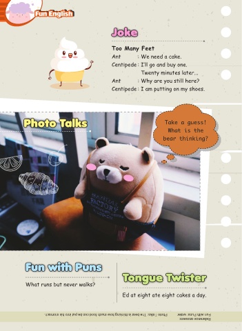 Ed at eight ate eight cakes a day. Fun with Puns: water Photo Talks: The bear is thinking how much food can be put into his stomach. Reference answers: