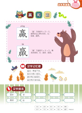 汉字双胞胎 赢 和 羸 yJng 赢 “赢”下面是月 + 贝 + 凡, 意思是在比赛中获胜,如: 输赢、赢家。 lFi 羸 “羸”下面是月 + 羊 + 凡,意 思是瘦弱,如:羸弱、羸瘦。 汉字记忆歌 猛地一看差不多, 其实也有小差别。 赢字有贝能取胜, 羸字有羊身体弱。 汉字接龙 赢家 家 羸弱 弱 木块 庄园 树木 村庄 小树 乡村 弱小 家乡 羸弱 赢家 参考答案: