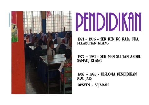 PENDIDIKAN 1971 – 1976 - SEK REN KG RAJA UDA, PELABUHAN KLANG 1977 – 1981 - SEK MEN SULTAN ABDUL SAMAD, KLANG 1982 – 1985 - DIPLOMA PENDIDIKAN KDC JAIS OPSYEN - SEJARAH