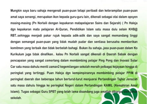Islami). Tugas sebagai Guru SPBT yang telah lama disandang juga amatlah dihargai oleh pihak