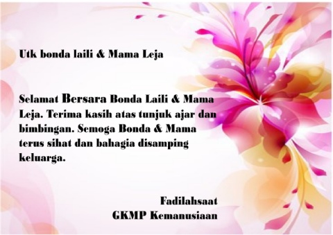 Utk bonda laili & Mama Leja Selamat Bersara Bonda Laili & Mama Leja. Terima kasih atas tunjuk ajar dan bimbingan. Semoga Bonda & Mama terus sihat dan bahagia disamping keluarga. Fadilahsaat GKMP Kemanusiaan