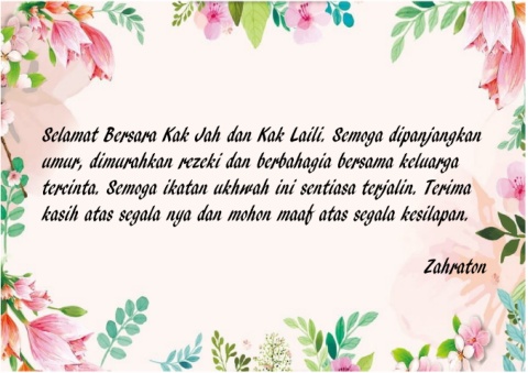 Selamat Bersara Kak Jah dan Kak Laili. Semoga dipanjangkan umur, dimurahkan rezeki dan berbahagia bersama keluarga tercinta. Semoga ikatan ukhwah ini sentiasa terjalin. Terima kasih atas segala nya dan mohon maaf atas segala kesilapan. Zahraton