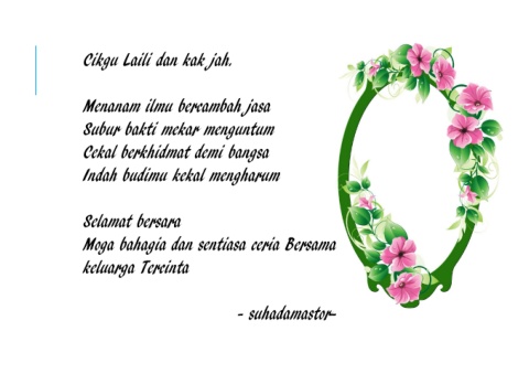 Cikgu Laili dan kak jah. Menanam ilmu bercambah jasa Subur bakti mekar menguntum Cekal berkhidmat demi bangsa Indah budimu kekal mengharum Selamat bersara Moga bahagia dan sentiasa ceria Bersama keluarga Tercinta - suhadamastor-